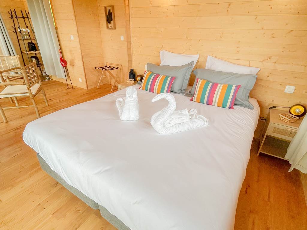 Pensé pour deux personnes, ce lodge dispose d’un lit double spacieux, d’une salle de bain moderne avec douche à l’italienne, et d’une terrasse privative avec jacuzzi, idéal pour un moment de détente absolue.